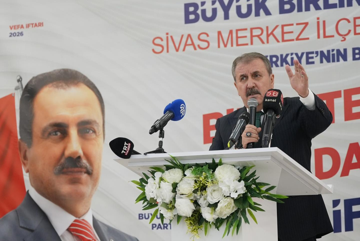 Büyük Birlik Partisi Genel Başkanı Mustafa Destici, Merkez İlçe Başkanlığının düzenlediği “Birlikte Aynı Sofrada 33. Yıl Vefa İftarı” programına katıldı. Destici burada yaptığı konuşmada, Sivas Belediye Başkanı Dr. Adem Uzun'un yaptığı hizmetlerin, partilerinin oylarının artmasında büyük katkı verdiğini ifade etti. Mustafa Destici "Yaptığımız son 2 kamuoyu araştırmasına göre partimize olan destek 3 kat arttı." dedi.