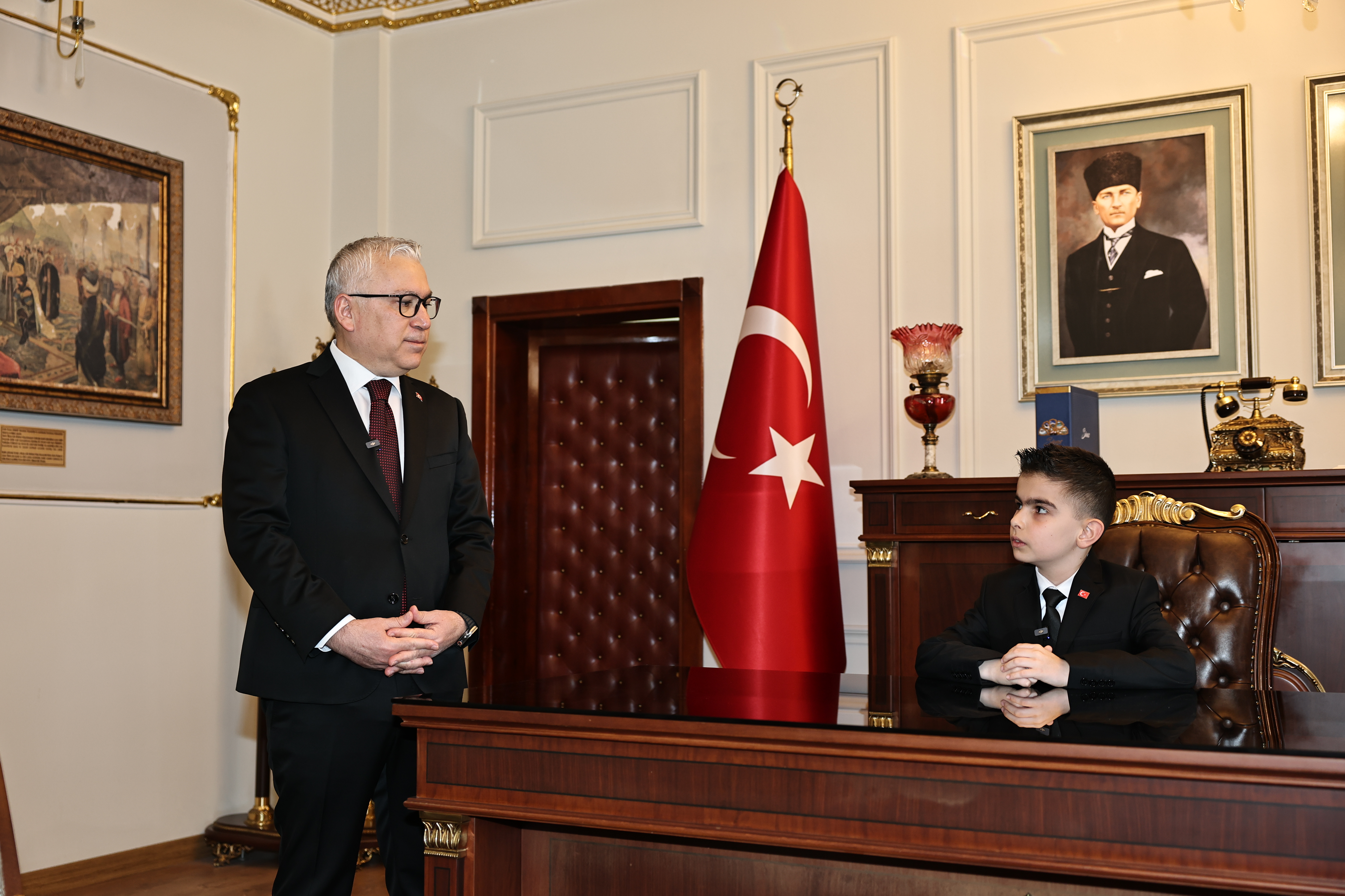 Çocukların 23 Nisan Ulusal Egemenlik ve Çocuk Bayramı'nı kutlayan Valimiz Şimşek “Bugün 23 Ulusal Egemenlik ve Çocuk Bayramı'nı Sivas'ımızda da büyük bir gururla ama aynı zamanda buruk bir şekilde kutluyoruz. Ben öncelikle tüm çocuklarımızın Ulusal Egemenlik ve Çocuk Bayramı'nı tebrik ediyorum. Tabii bugün çocukların günü ve makamda çocukların bizler bugün vesilesiyle çocuklarımızı ve sayın valimizi makamımızda ağırlamaktan büyük bir mutluluk duyuyoruz” dedi.