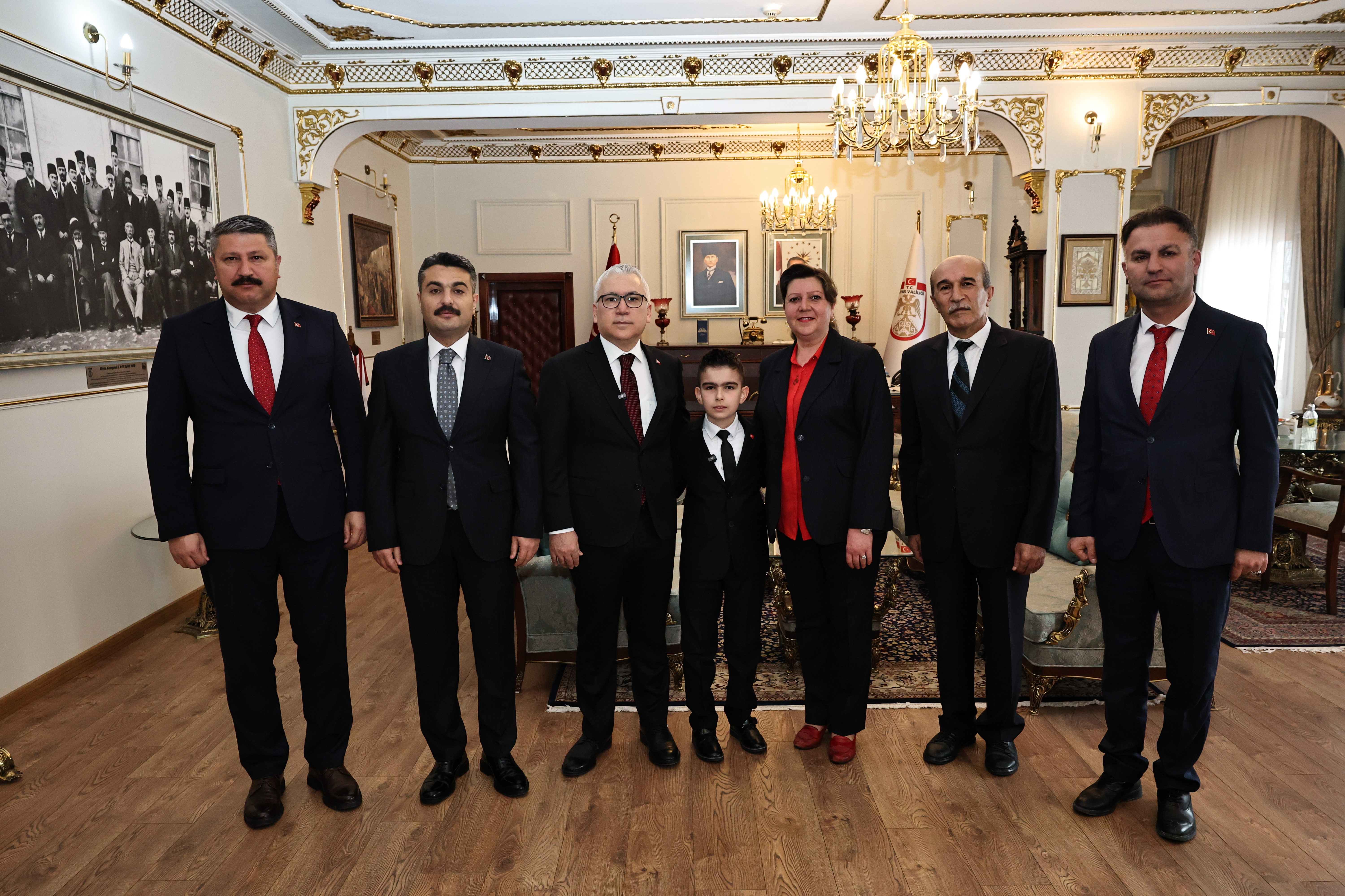 Sivas Valisi Yılmaz Şimşek, 23 Nisan Ulusal Egemenlik ve Çocuk Bayramı'nın 106. yılı münasebetiyle İl Millî Eğitim Müdürü Fatih Erdoğan, Fevzipaşa İlkokulu öğretmenleri ve öğrencilerini makamında kabul etti.