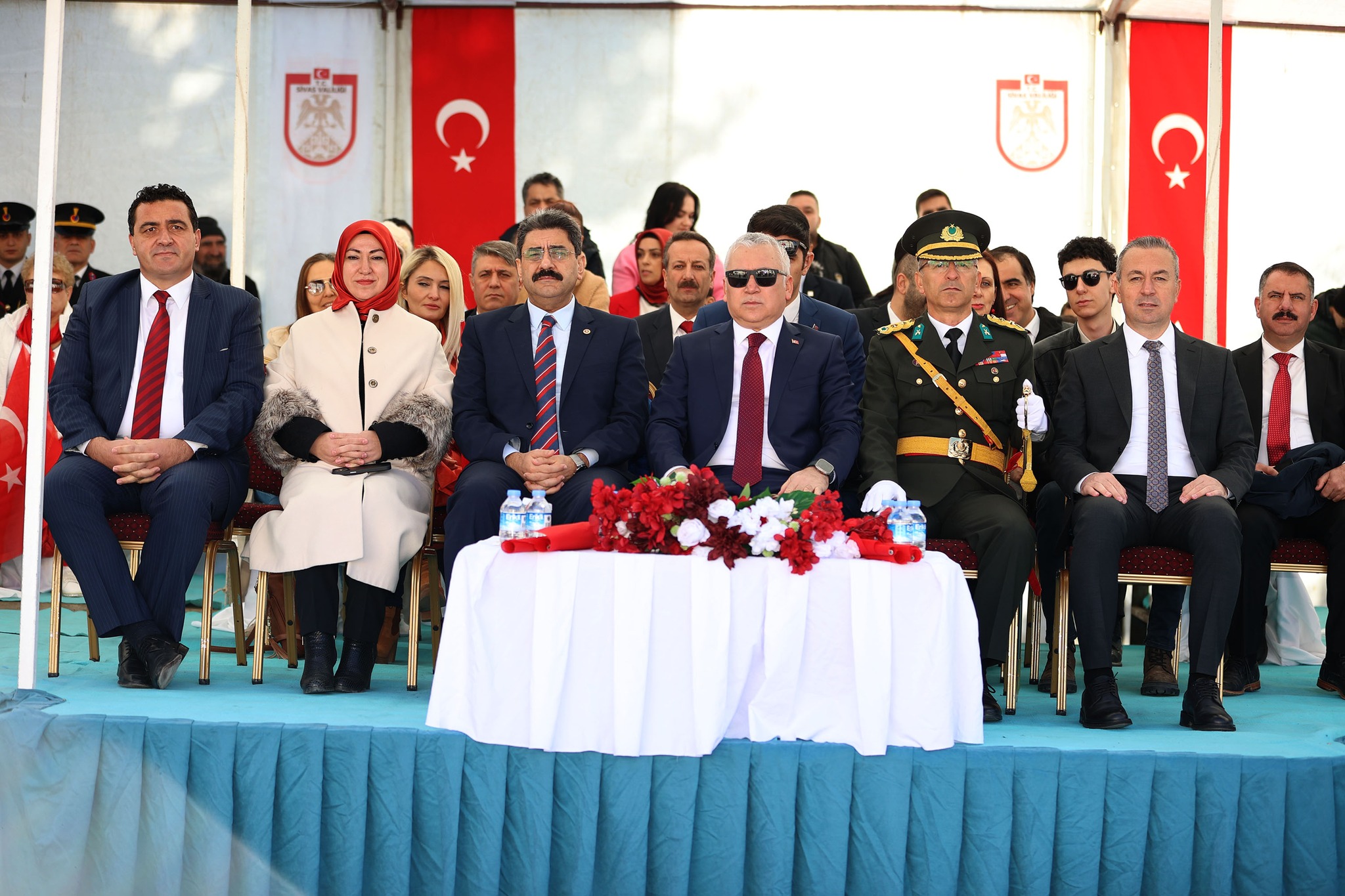 Vali Yılmaz Şimşek, Garnizon Komutanı Piyade Albay Cüneyt Mutlu ve Sivas Belediye Başkanı Adem Uzun, askeri araçla halkı selamladı.