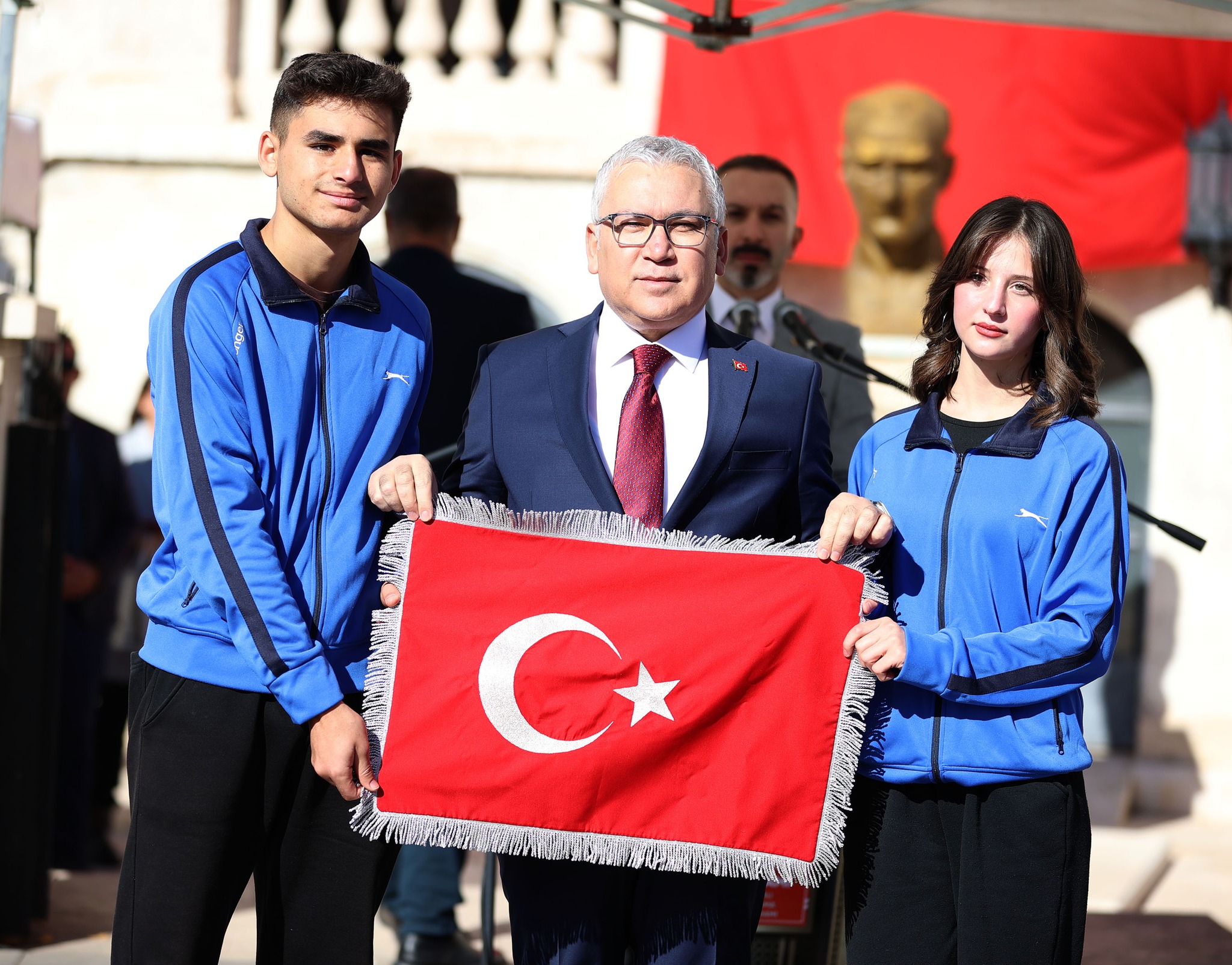 Konuşmaların ardından İl Milli Eğitim Müdürlüğü koordinesinde yapılan, "Cumhuriyet Yolunda" yürüyüş programı sonunda öğrenciler tarafından Vali Şimşek'e Türk bayrağımız teslim edildi.