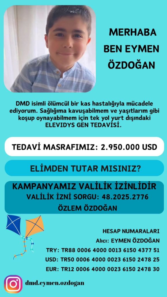 Eymen’in ailesi, yurt dışında uygulanan ve umut vadeden “Elevidys Gen Tedavisi” için tam 2 milyon 950 bin dolar tutarında bir maliyetle karşı karşıya. Valilik izniyle başlatılan kampanya kapsamında tüm vatandaşlara destek çağrısı yapılıyor.