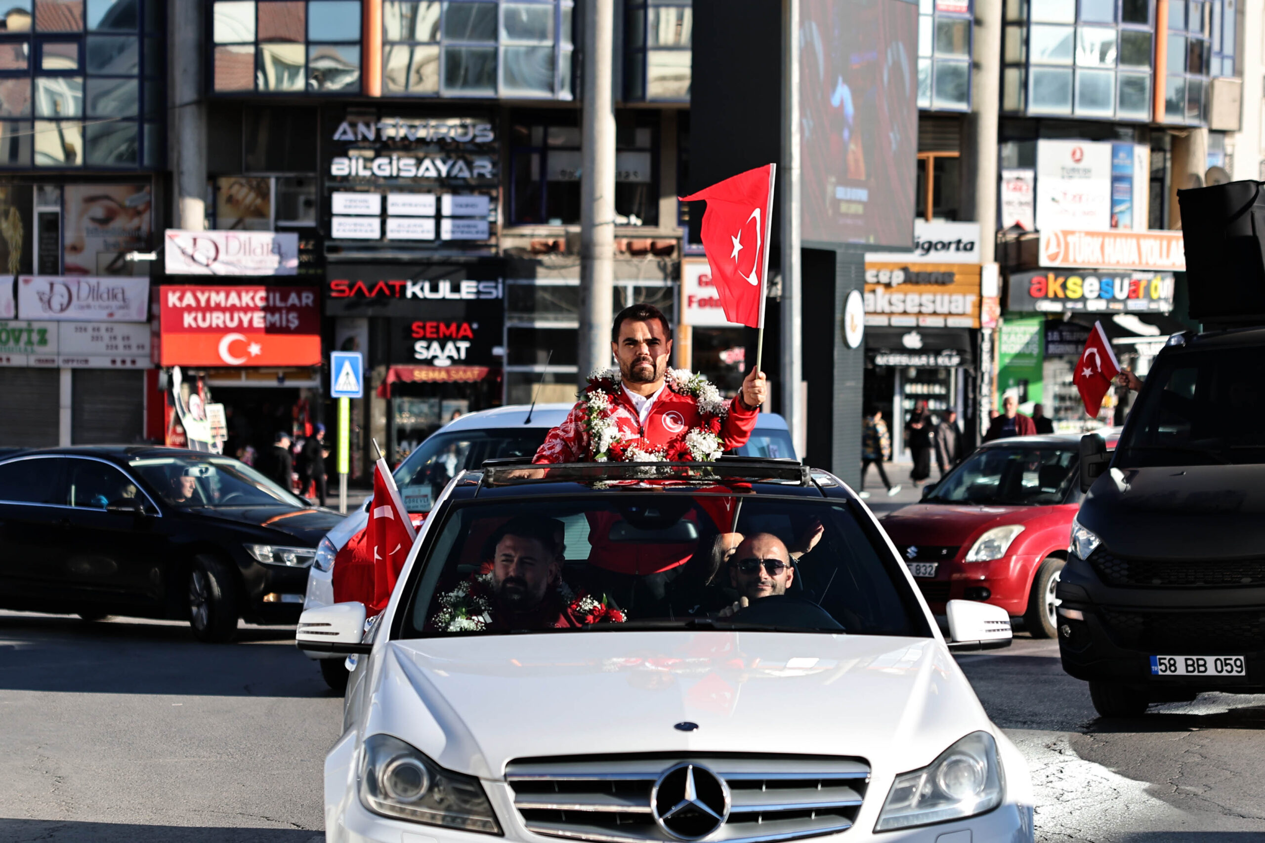 Konvoy eşliğinde Sivas Valiliği'ne gelen dünya şampiyonu Kayapınar, Vali Yılmaz Şimşek tarafından karşılandı.