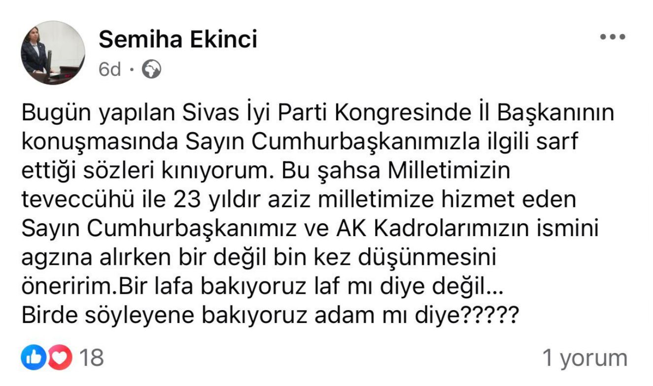 “Bugün yapılan Sivas İYİ Parti Kongresinde İl Başkanının konuşmasında Sayın Cumhurbaşkanımızla ilgili sarf ettiği sözleri kınıyorum. Bu şahsa, milletimizin teveccühü ile 23 yıldır aziz milletimize hizmet eden Sayın Cumhurbaşkanımız ve AK Kadrolarımızın ismini ağzına alırken bir değil bin kez düşünmesini öneririm.