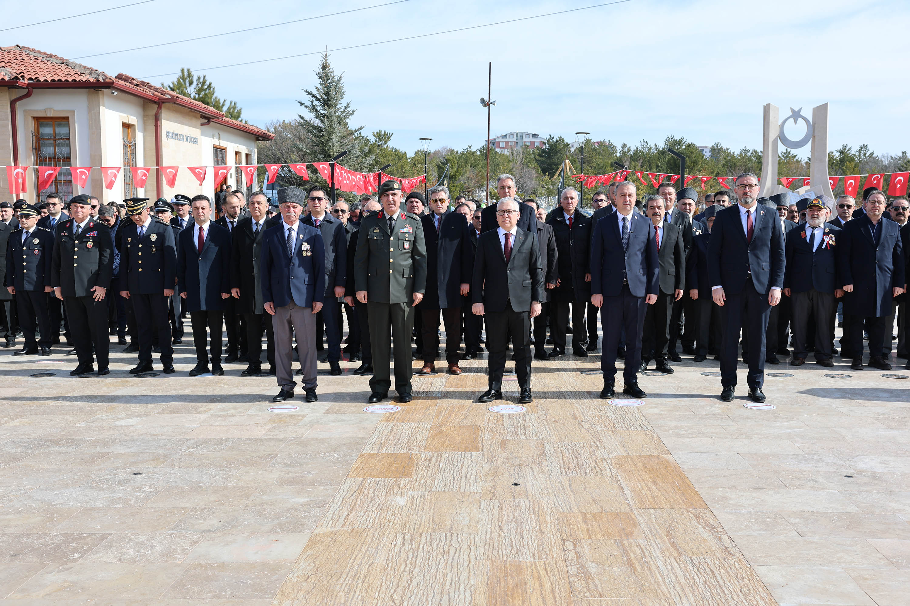 Saygı duruşunda bulunulması ve İstiklal Marşı'nın okunmasıyla başlayan törende, protokol üyeleri tarafından şehitlik anıtına çelenk sunuldu. Törenin ardından Vali Şimşek ve beraberindekiler, şehit mezarlarını ziyaret ederek karanfil bıraktı, dua etti.