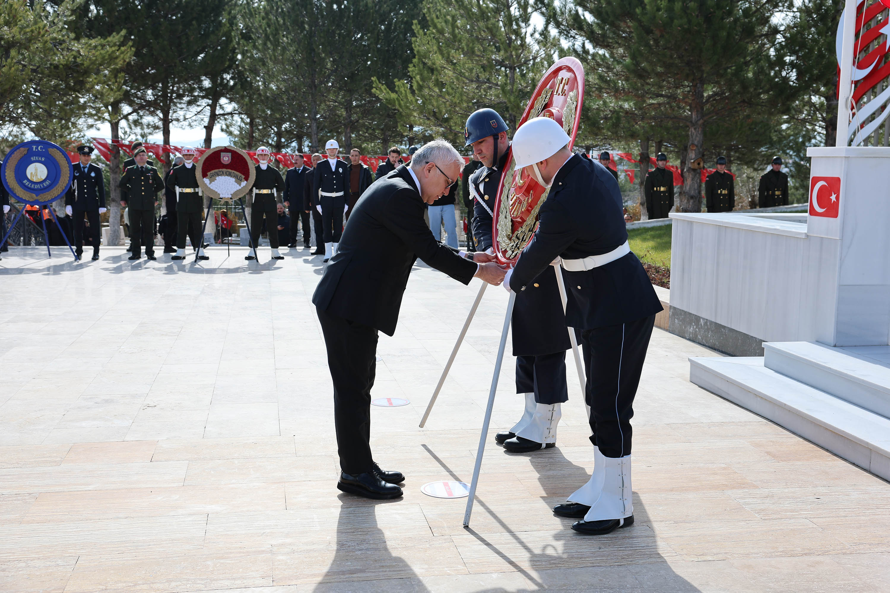 Programlar kapsamında ilk olarak Yukarı Tekke Mezarlığı'nda bulunan Garnizon Şehitliği'nde tören gerçekleştirildi. Törene, Sivas Valisi Yılmaz Şimşek, 5'inci Piyade Eğitim Tugay ve Garnizon Komutanı Tuğgeneral Zeynel Abidin Alptekin, Belediye Başkanı Adem Uzun, il protokolü, gaziler ve şehit yakınları katıldı.