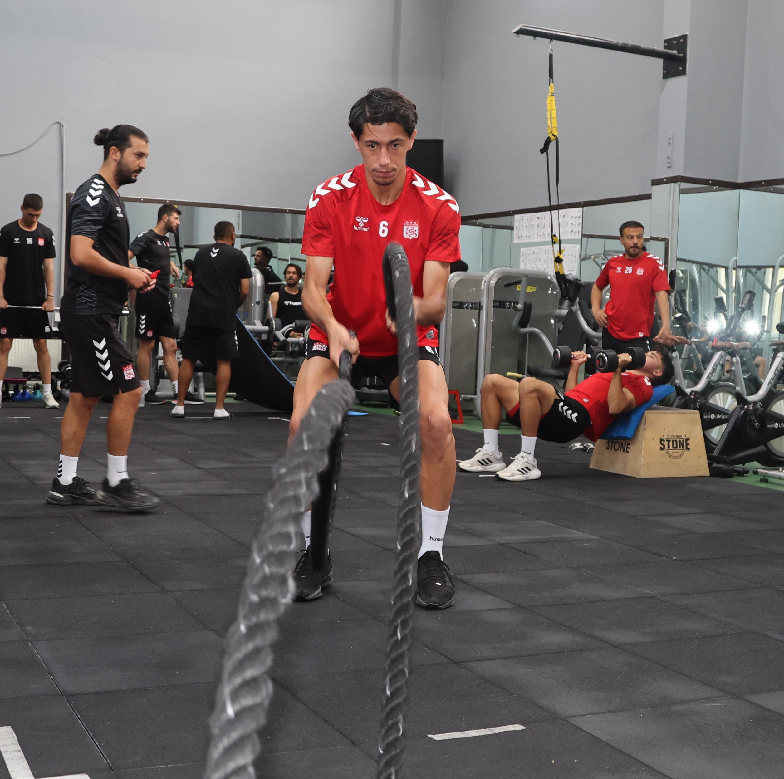 Futbolcular, iki grup halinde fitness salonunda koordinasyon ve kuvvet odaklı çalışmalar gerçekleştirdi.