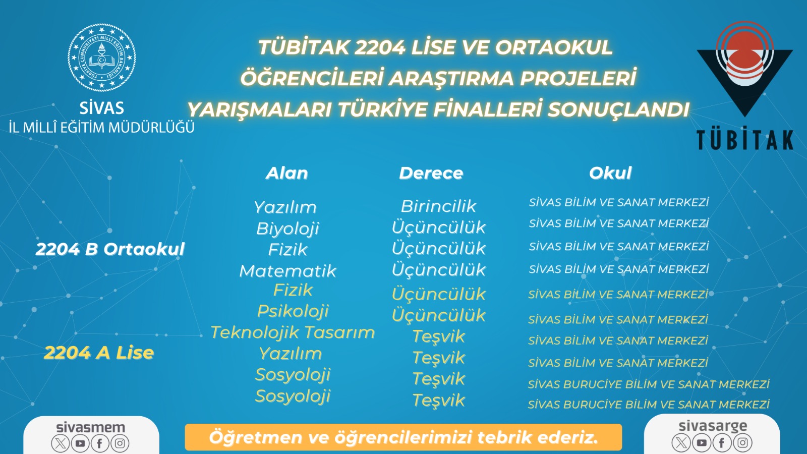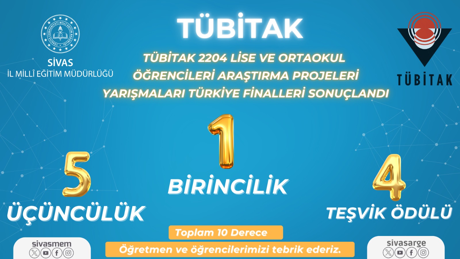 14 Proje ile finalde yarışan öğrencilerimiz, 1 birincilik, 5 üçüncülük ve 4 teşvik ödülü kazanarak önemli bir başarı elde etti. Finalde Sivas için önemli ilkler de yaşandı. Türkiye finallerinde ilk kez birincilik başarısı elde edilirken, en fazla derece sayısına da ulaşılarak bir ilke imza atıldı.